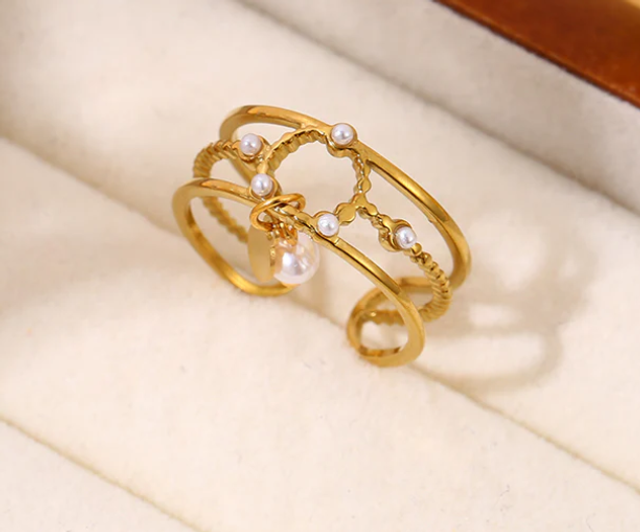 Bague Dorée Triple Ligne Avec Pendentif Perle Synthétique