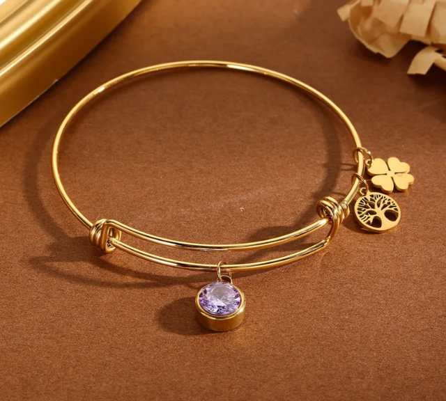 Bracelet Doré Jonc Ajustable Avec Pendentifs Trèfle Arbre Et Strass Violet